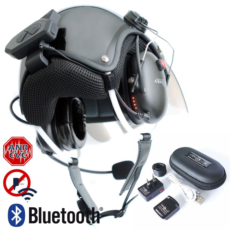 W skład zestawu wchodzą: Kask ochronny ze skorupą z włókna węglowego, aktywne słuchawki tłumiące z mikrofonem w całości wykonane z włókna węglowego, moduły do łączności bezprzewodowej pilot-pasażer i pilot-radio oraz bezprzewodowy przycisk nadawania PTT.